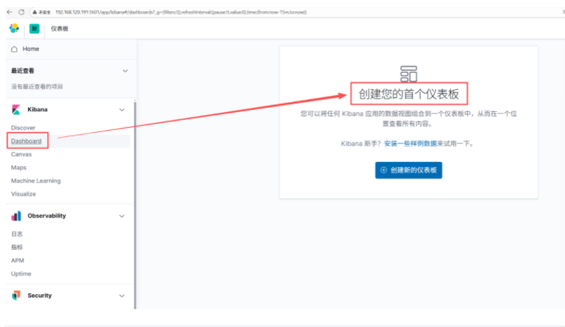 导入仪表盘之前,打开 http://192.168.120.191:5601/,查看 Dashborad,是没有现成的仪表盘: