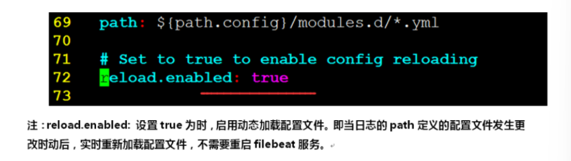 [root@node2 ~]# systemctl restart filebeat互动: 修改完/etc/filebeat/modules.d/nginx.yml 后,需要重启 filebeat 服务吗?答: 不需要。因为前面开启了这个参数。如下: