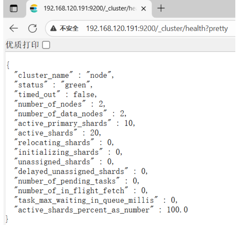 启动 node1,访问:http://192.168.120.191:9200/_cluster/health?pretty 发现是 green 状态。