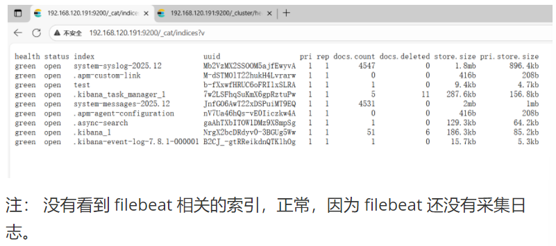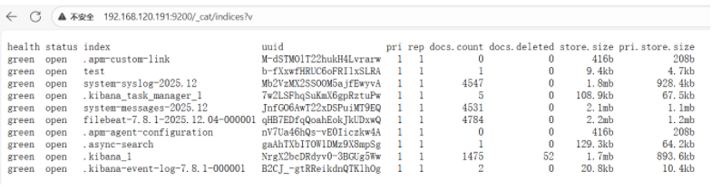 root 2095 0.0 0.0 112824 976 pts/0 S+ 10:15 0:00 grep --color=auto filebeat到 es 服务器上查看索引: http://192.168.120.191:9200/_cat/indices?v