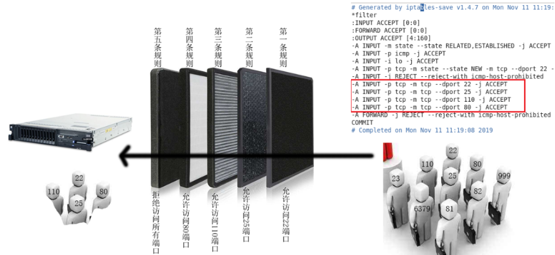 对于Linux防火墙而言, 当网络访问到服务器后, 防火墙会首先判断,该请求对应访问的端口号是否在防火墙中已经被放行, 如果没有, 直接返回拒绝连接, 如果已经放行, 可以访问相关的服务项
