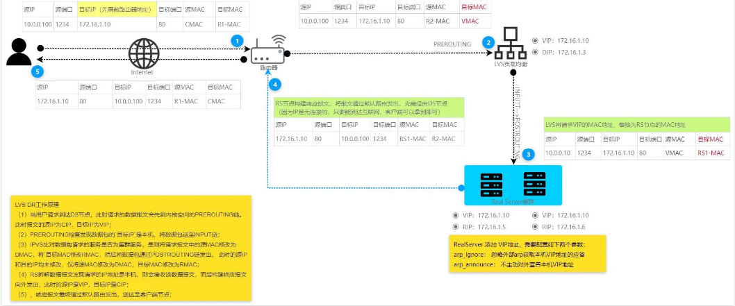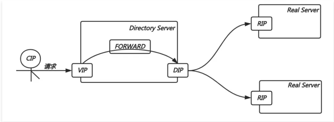 通过修改请求报文的 目标IP 地址,而后根据调度算法挑选出⼀台 RS 节点进行转发。