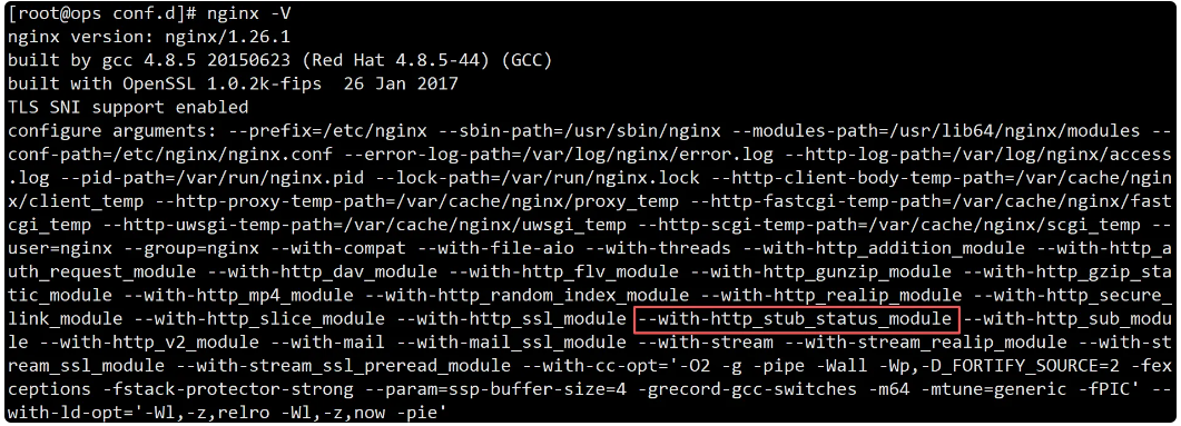 configure arguments: --prefix=/apps/nginx --user=nginx --group=nginx --with-http_ssl_module --with-http_v2_module --with-http_realip_module --with-http_stub_status_module --with-http_gzip_static_module --with-pcre --with-stream --with-stream_ssl_module --with-stream_realip_module
