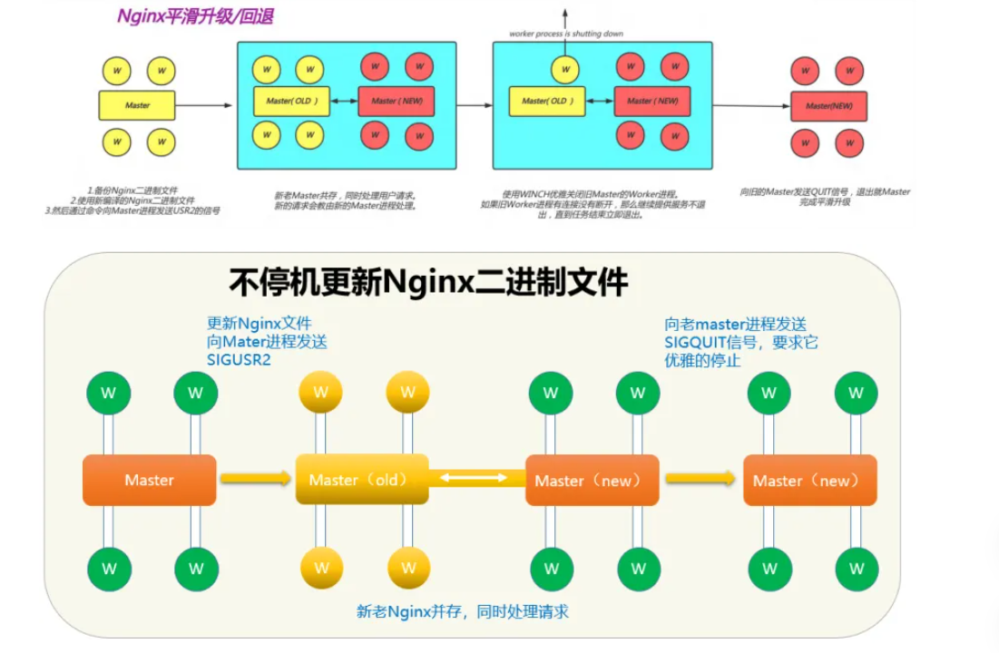 旧版和新版nginx的master和worker进程并存,由新版nginx接收处理用户的新请求