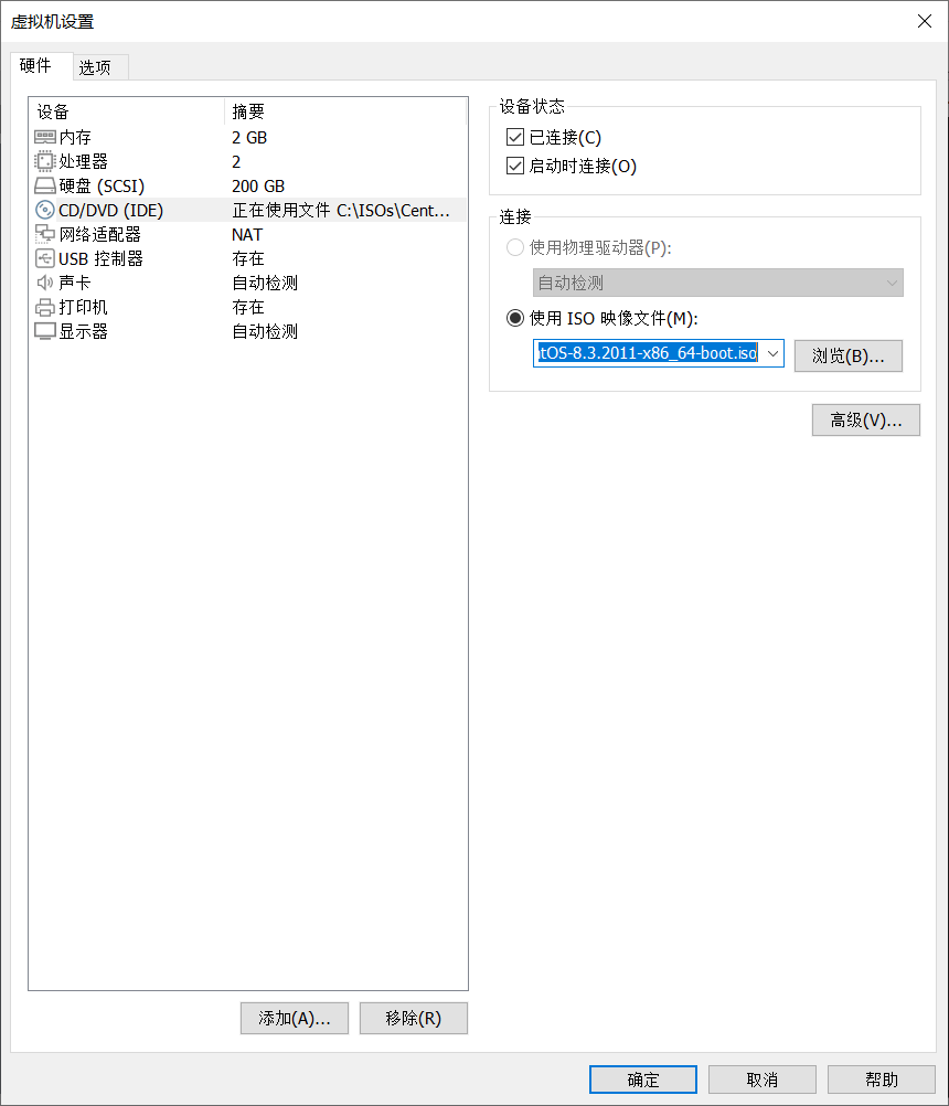 [root@centos8 ~]#mount /dev/sr0 /var/www/html/centos/8/创建新的虚拟机,关联 CentOS-8.3.2011-x86_64-boot.iso文件到光驱,配置如下: