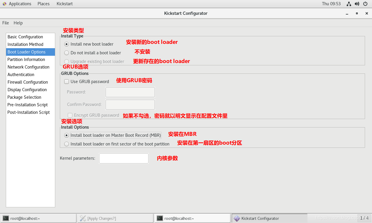 NFS server:ks=nfs:host:/path/to/KICKSTART_FILE范例:用boot光盘启动利用网络源安装