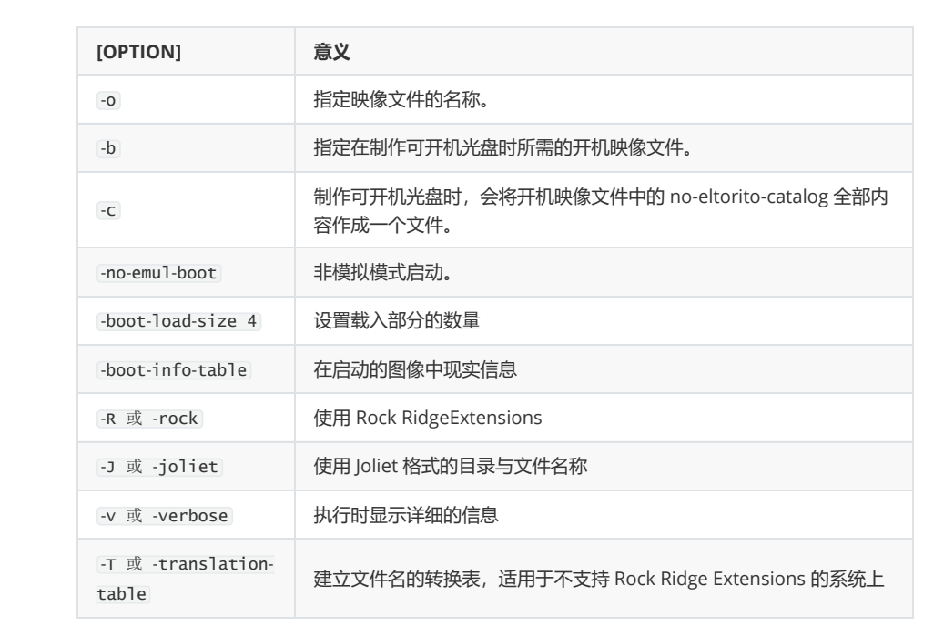- isolinux.bin:光盘引导程序,在mkisofs的选项中需要明确给出文件路径,这个文件属于SYSLINUX项目