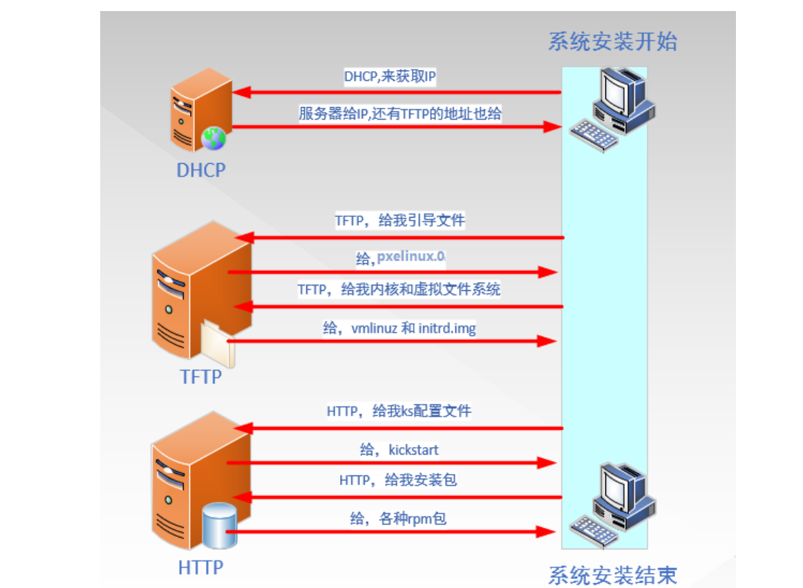 Client通过内核参数下载kickstart文件,并根据kickstart文件里的安装信息,下载安装源文件进行自动化安装